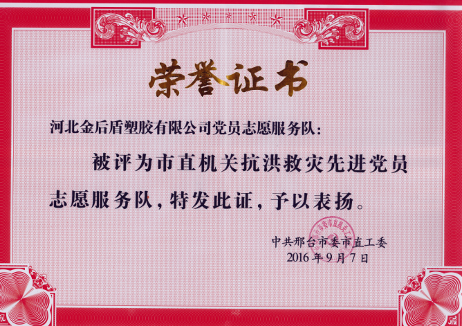 2016年邢臺(tái)洪災(zāi),金后盾第一時(shí)間與預(yù)備役組成抗洪救災(zāi)救援隊(duì),連續(xù)多日每天出動(dòng)幾十人,并捐獻(xiàn)急需物資、車輛,金后盾董事長李彥平被市委評為邢臺(tái)市“抗洪救災(zāi)先進(jìn)個(gè)人”、集體被評為“抗洪救災(zāi)先進(jìn)集體”。